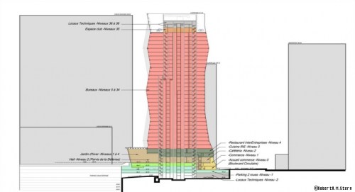 The building for offices and stores , 47,100 and 366 m² , distributed over 38 floors above ground level and two basements and other services that offer 135 parking spaces. Approximately 155 meter high above the atrium of Defense , reaching 166m from the Boulevard Circulaire . These lower plants and the conservatory are low iron glass mullion structural glass .