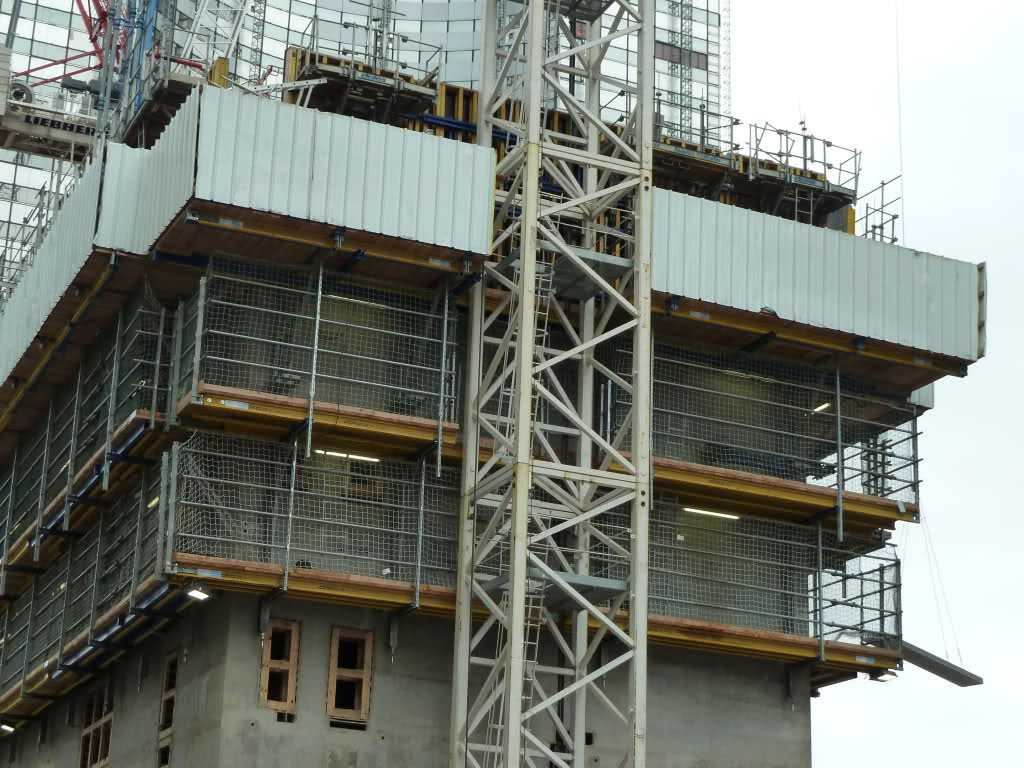 Designed in standards of green building, the automatic automatic climbing formwork SKE 50 plus Doka ‘ allowed the construction progressed very fast , despite the narrow and inaccessible condition of the place. In this case the casing was also used as a shield that would ensure high safety in the workplace . Doka technicians devised a special profile that the adjustable brackets are joined floor , allowing the work platform is moved back and forth within a certain range . In addition, four units were designed deckin gap- hinged for each platform , which can be tilted up or down in each block and close the gap between the platform and the floor slab as required. Each shield covers the work platform and two more levels.